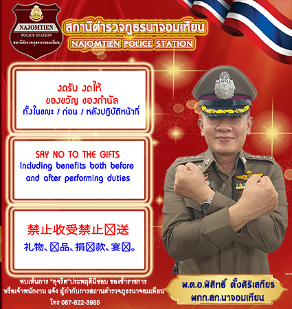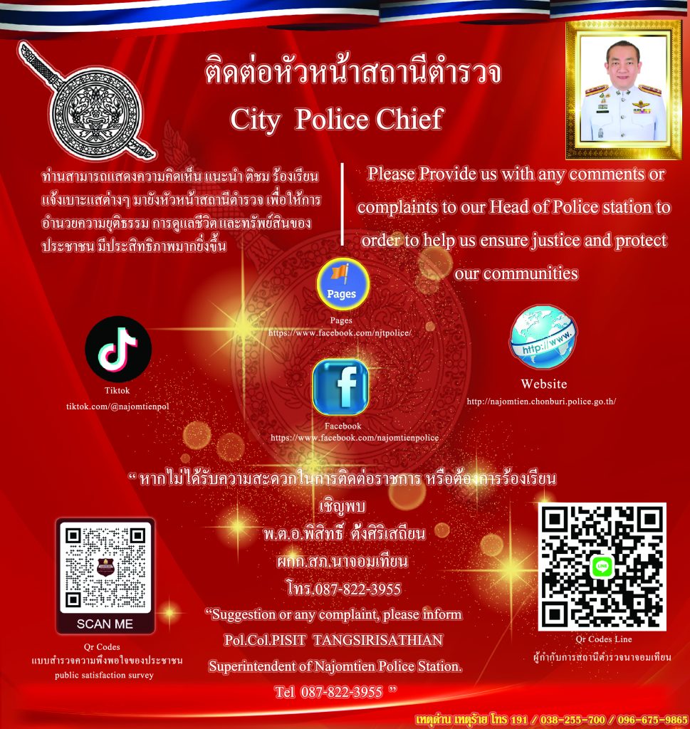 สภ.นาจอมเทียน วันนี้ 14 ธ.ค.68 เวลา 06.00น. พ.ต.อ.พิสิทธิ์ ตั้งศิริเสถียร  ผกก.สภ.นาจอมเทียน พ.ต.ท.ชัยเมศร์ ไชยวรรณรุจน์  รอง ผกก.ป.สภ.นาจอมเทียน พ.ต.ท.อดิศร กองโกย  รอง ผกก.สส.สภ.นาจอมเทียน...